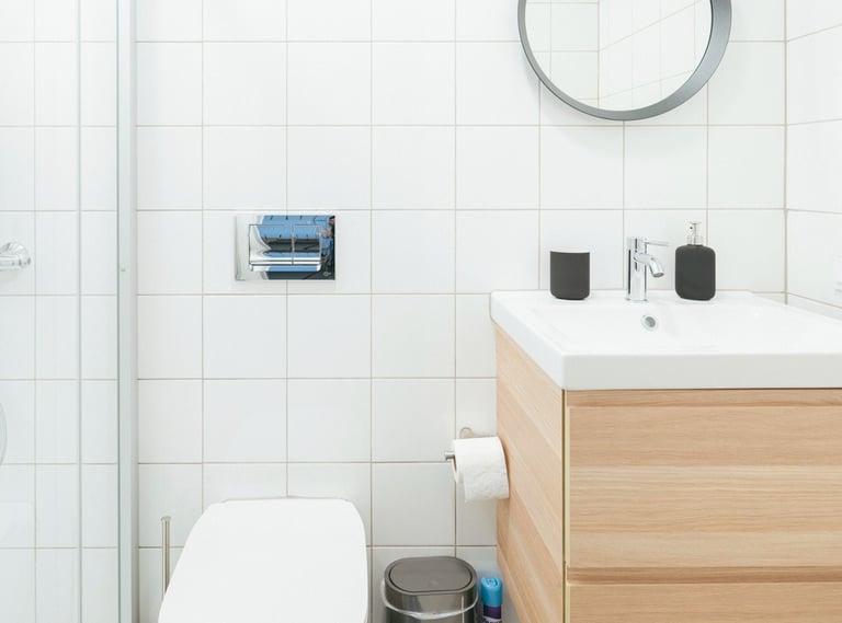 wc - baltos matinės plytelės + sienos fragmentai dažyti pilka spalva.