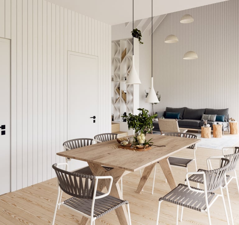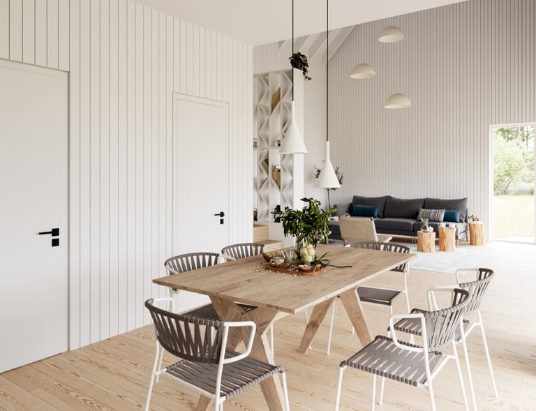 - Apšvietimas: numatytas visų patalpų bendras apšvietimas, jaukumui sukurti galima naudoti toršerus arba stalinius šviestuvus;