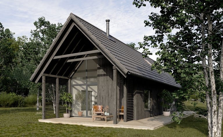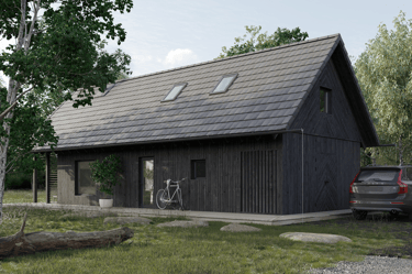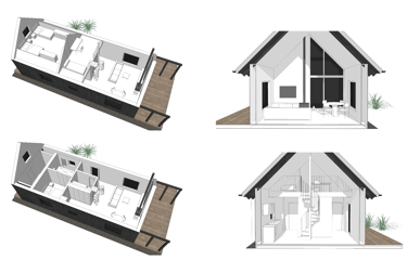 „Kovas“ - 65 kv.m. vasarnamis, aukštų lubų dėka sukuria erdvumo pojūtį bei talpina du uždarus miegamuosius. Šiame pastate daug įdomių, netipinių sprendimų, sukurtų pageidaujant klientui: linksmi įvairių dydžių langai, medinės lauko žaliuzės terasos šonams pridengti, aukšta svetainės vitrina.
