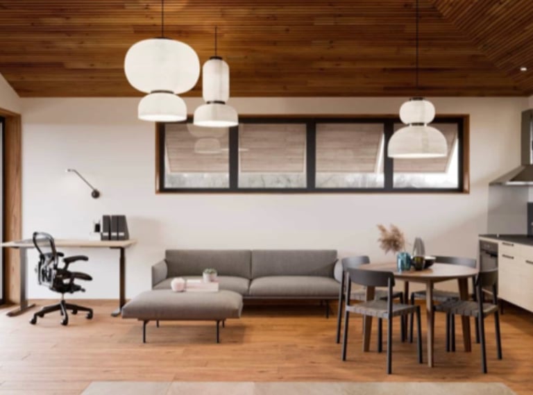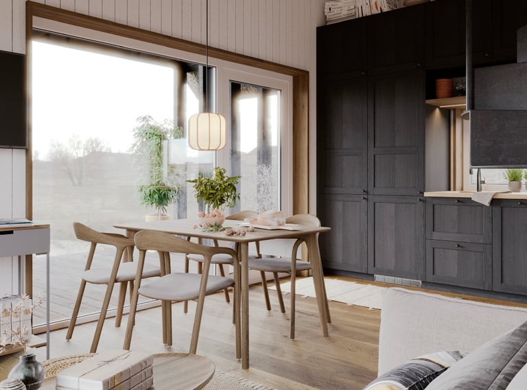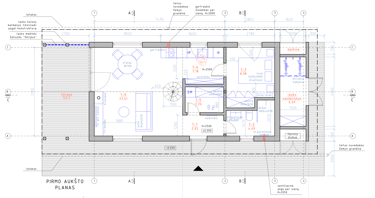 - Apšvietimas: numatytas visų patalpų bendras apšvietimas, jaukumui sukurti galima naudoti toršerus arba stalinius šviestuvus;
