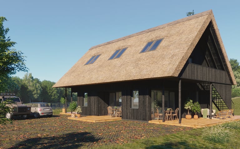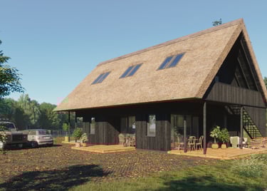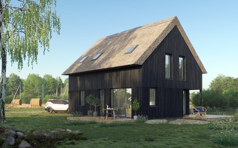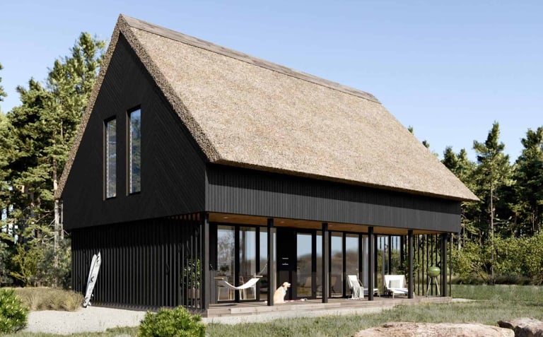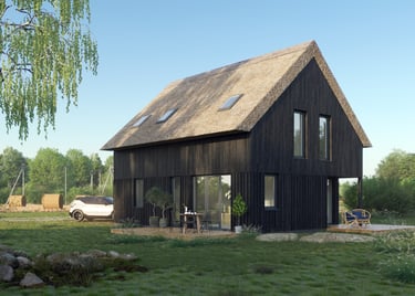 „Juodasis strazdas“ - Šeimos atostogų namas, jame suprojektuota erdvi svetainė ir virtuvė, šalia – uždaras šeimininkų miegamasis, patogus sanmazgas bei erdvi antresolė su dviem lovomis vaikams. „Juodojo Strazdo“ plotas- 41 kv.m.