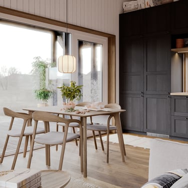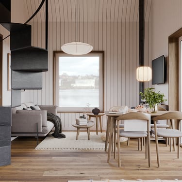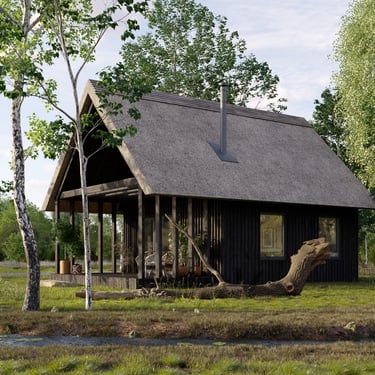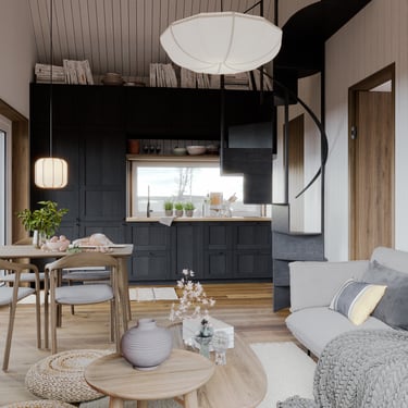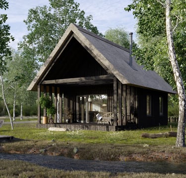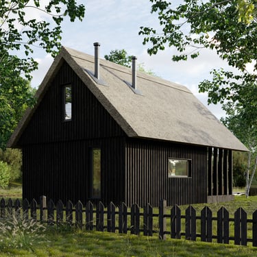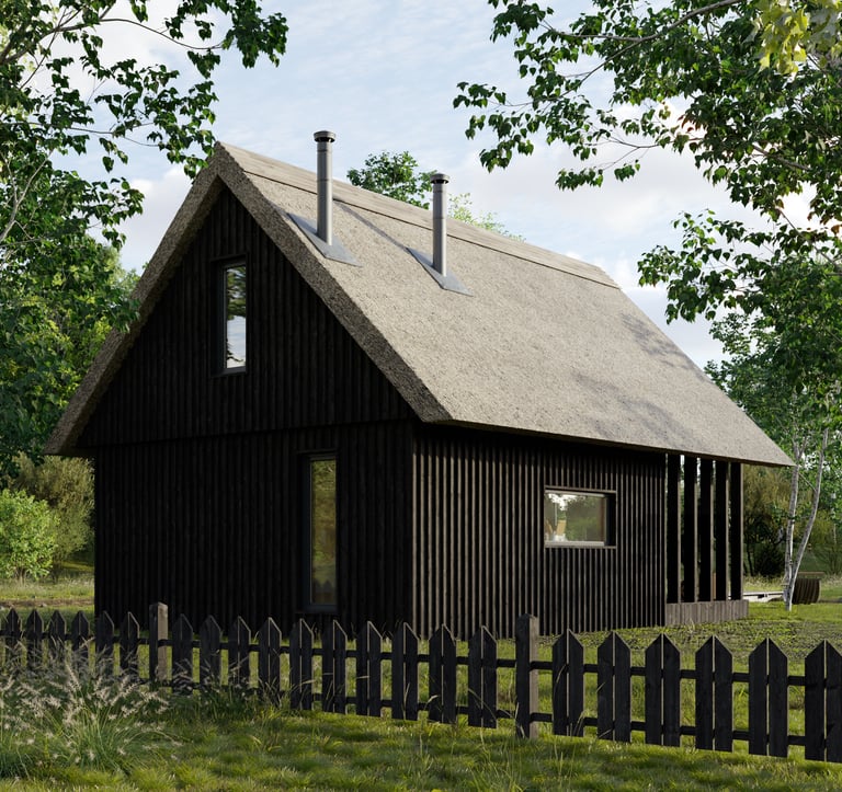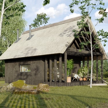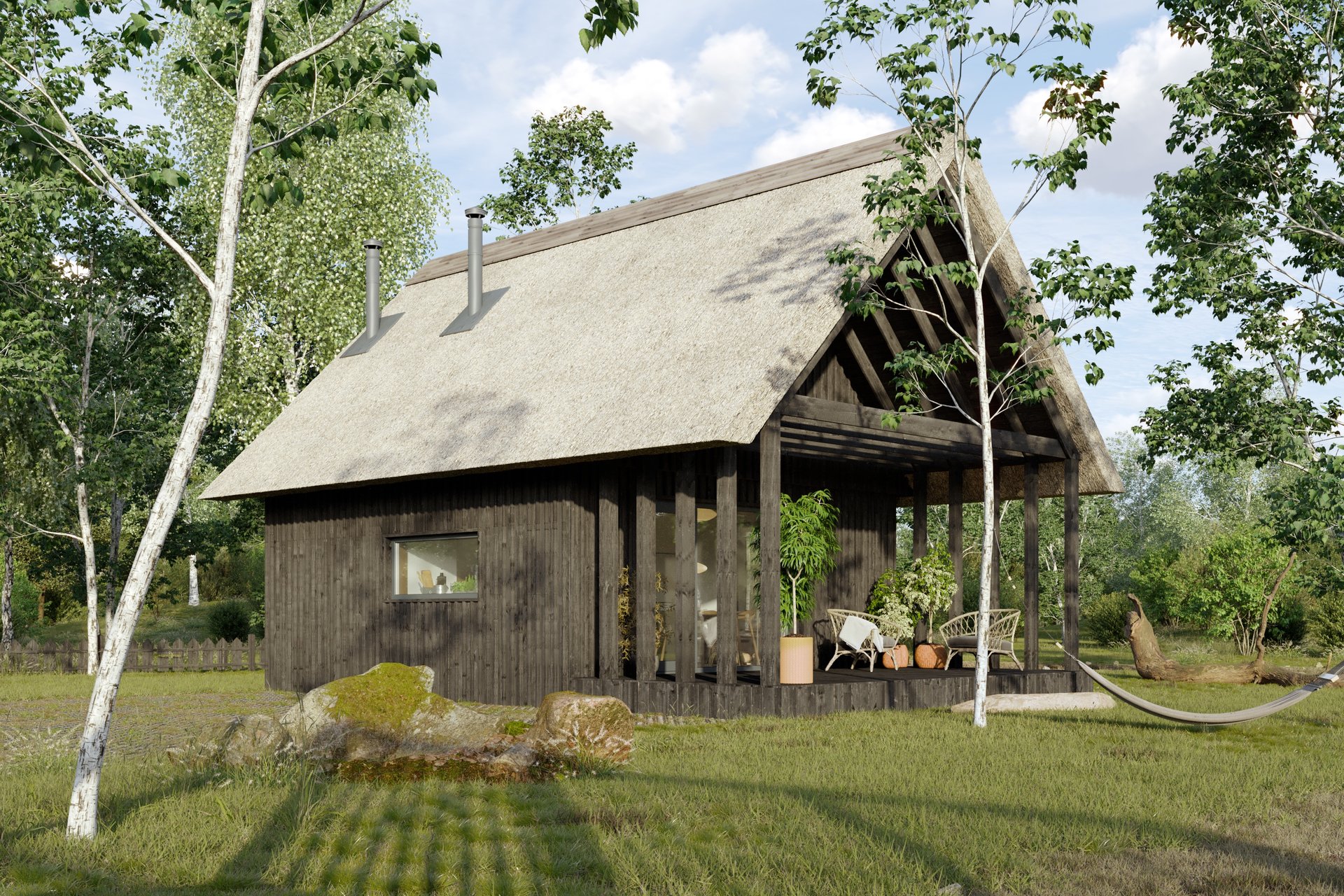 „Juodasis strazdas“ - Šeimos atostogų namas, jame suprojektuota erdvi svetainė ir virtuvė, šalia – uždaras šeimininkų miegamasis, patogus sanmazgas bei erdvi antresolė su dviem lovomis vaikams. „Juodojo Strazdo“ plotas- 41 kv.m.