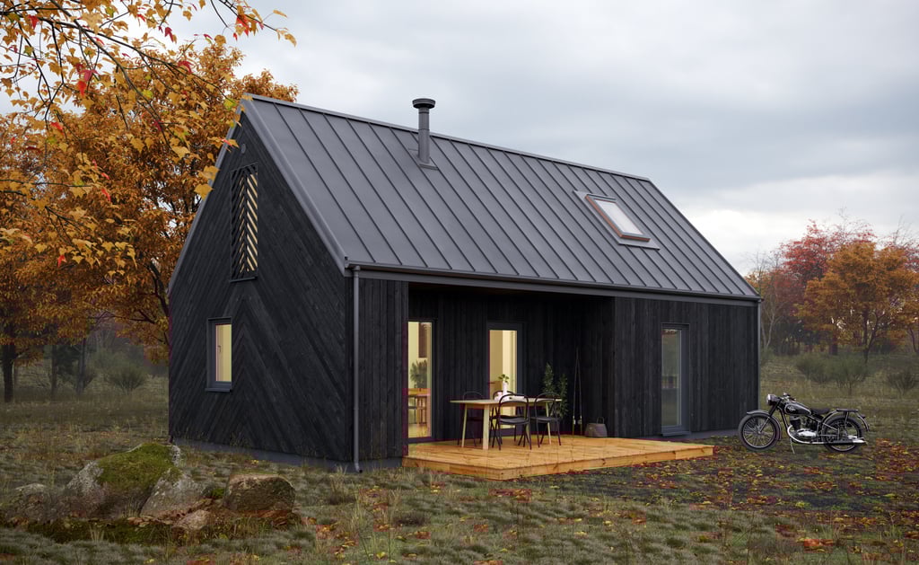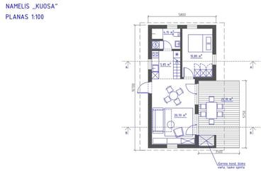 „Kuosa“ – Namas kupinas kuršiskos dvasios, „Strazdo“ sesuo, šiame name suprojektuota erdvi svetainė, kiek atskirta virtuvės zona, atskiras šeimininkų miegamasis ir antresolėje dviejų lovų miegamasis. “Kuosa“ plotas – 46,80 kv.m.