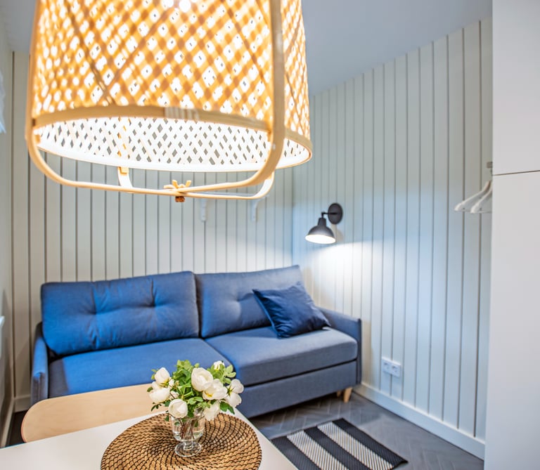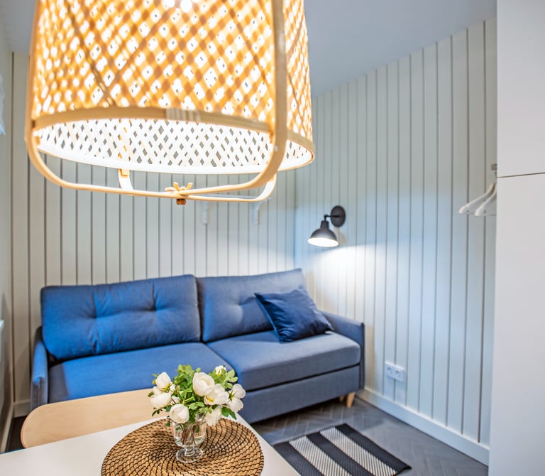 - Apšvietimas: numatytas visų patalpų bendras apšvietimas, jaukumui sukurti galima naudoti toršerus arba stalinius šviestuvus;