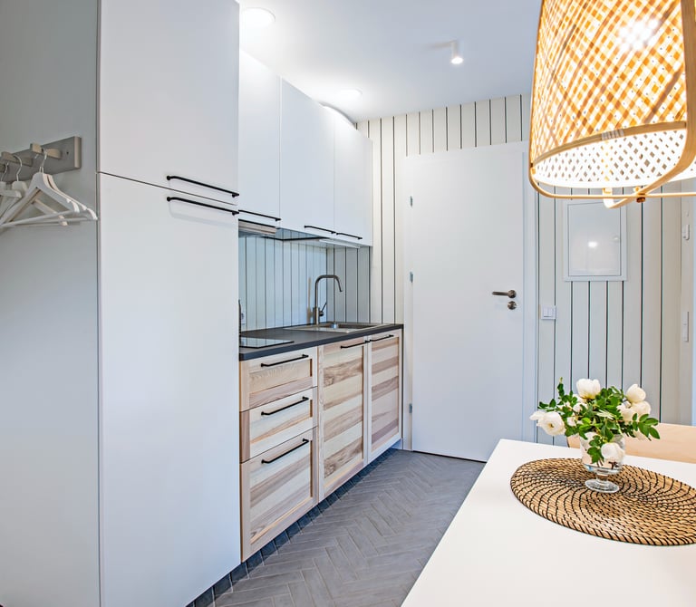 svetainė + virtuvė + miegamasis ir antresolė - laminatas;